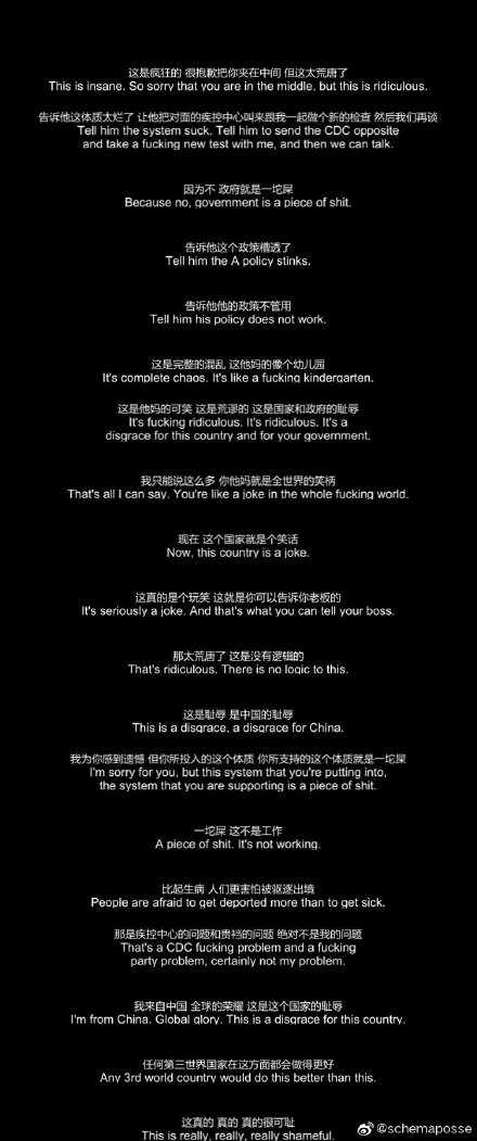 4月19日,微博热传一段上海疫情期间的通话录音,其内容是居住在上海的德国人罗斯(据字幕)接到居委会(徐汇东塘居委会)工作人员打来的电话要求前往方舱医院接受隔离(并提到“u have to go to the camp tonight”),然而罗斯对于政府混乱的疫情管理与协调措施表示愤怒,在不参杂对工作人员恶意地前提下怒骂“(The) government is a piece of shit. The system suck. It’s ridiculous. It’s a disgrace for you, for the government, for Shanghai, for China…like a joke in the whole fucking world. And third world country would do better than this.”(这个政府就像一坨屎,整个系统糟糕、荒谬透顶。这简直是你、政府、上海以及中国的耻辱….完全沦为世界的笑柄。任何一个第三世界国家都可以比这做得更好。)