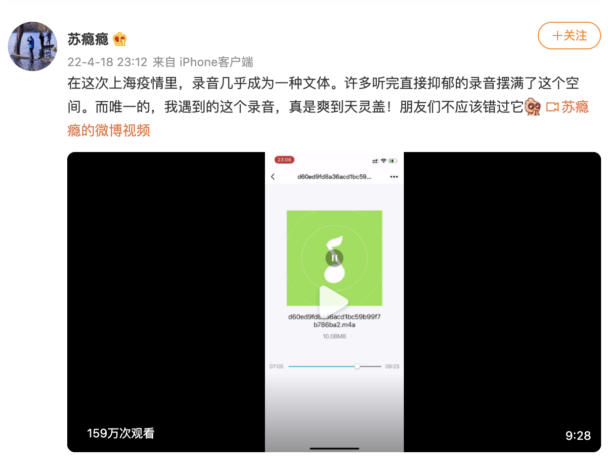 @苏瘾瘾:在这次上海疫情里,录音几乎成为一种文体。许多听完直接抑郁的录音摆满了这个空间。而唯一的,我遇到的这个录音,真是爽到天灵盖!朋友们不应该错过它。