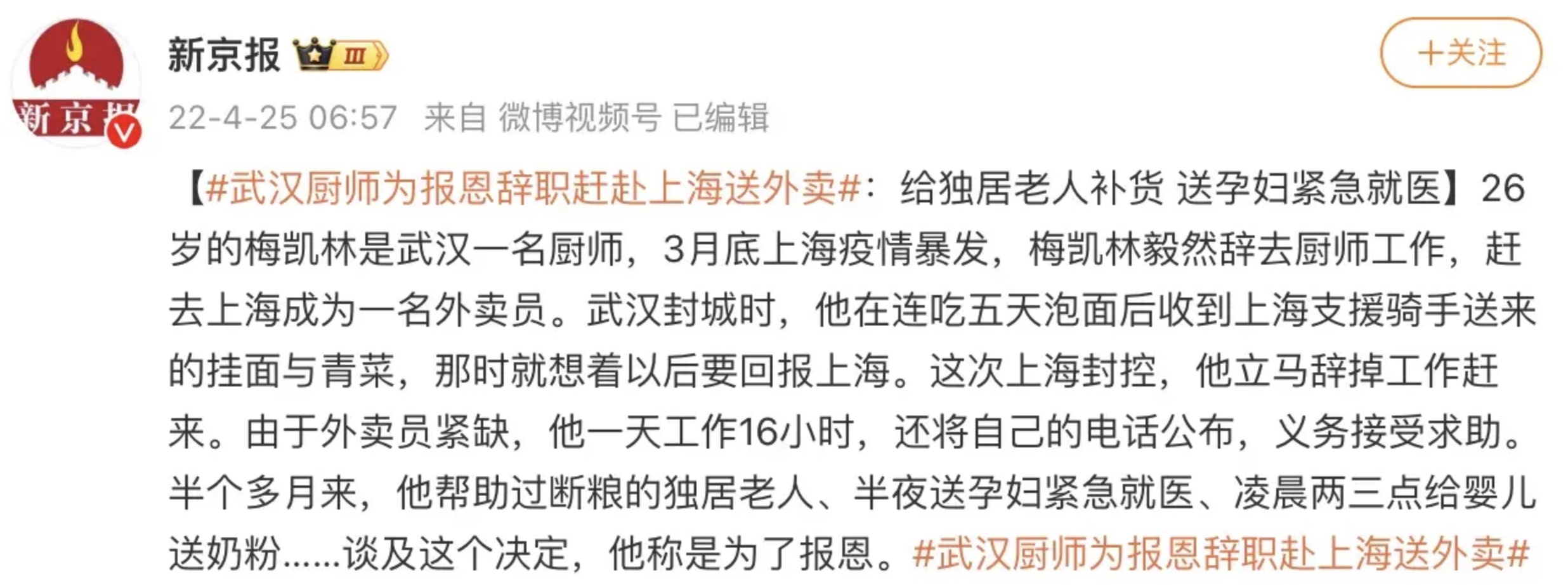 武汉厨师为报恩辞职赶赴上海送外卖:给独居老人补货 送孕妇紧急就医 | |